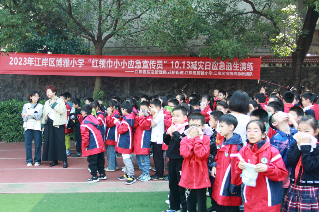 区应急管理局联合区花桥街道、博雅小学、区宝捷应急救援队等单位共同举办2023年“10.13”减灾宣传暨江岸区“红领巾小小应急宣传员”的活动。通过开展校园地震逃生演练,给学生上一堂应急逃生安全知识科普课,增强全校师生的安全意识,提高自然灾害应急处置和逃生自救能力。
