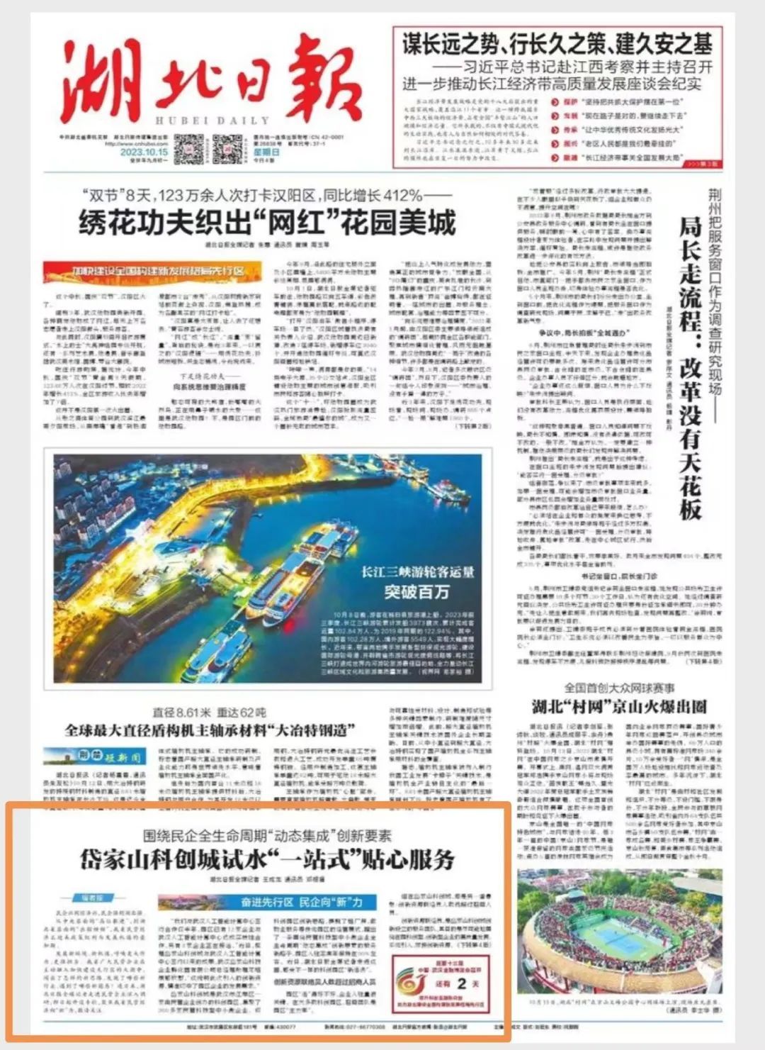 10月15日,《湖北日报》头版“奋进先行区 民企向‘新’力”专栏报道江岸区岱家山科创城创新思路,蹚出一条围绕民营科技型中小微企业全生命周期“动态集成”创新要素的服务新路子。全文如下: