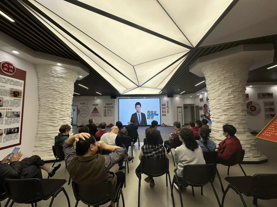 新村街道黑泥湖社区妇联组织辖区妇女、志愿者开展禁毒宣传活动。社区禁毒工作人员向居民详细介绍有关法律法规,并播放《向毒品说不,从你我做起!》禁毒公益宣传片,带领大家了解毒品的危害、毒品的预防方法等知识,筑牢居民防毒意识。