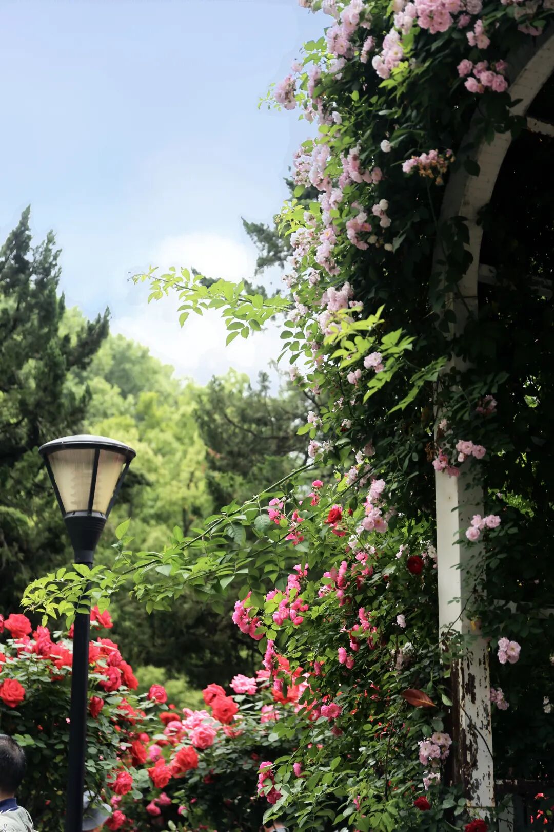高高低低的蔷薇姿态不一,高处的挺拔昂扬,低处的垂朵博爱,各有美感。
