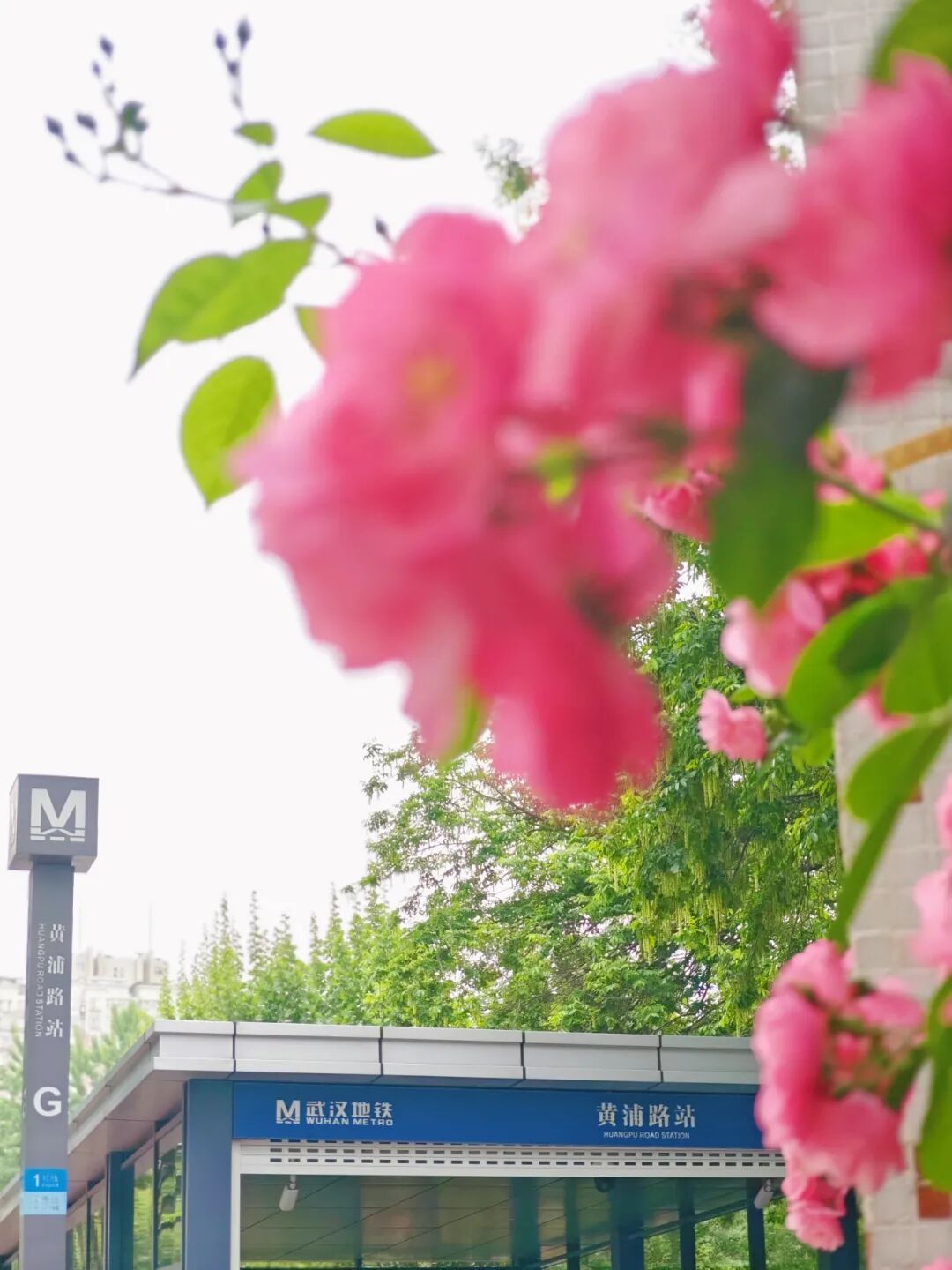 在黄浦路地铁站,从G出口走出去,一大排粉色的蔷薇花跃入眼帘。