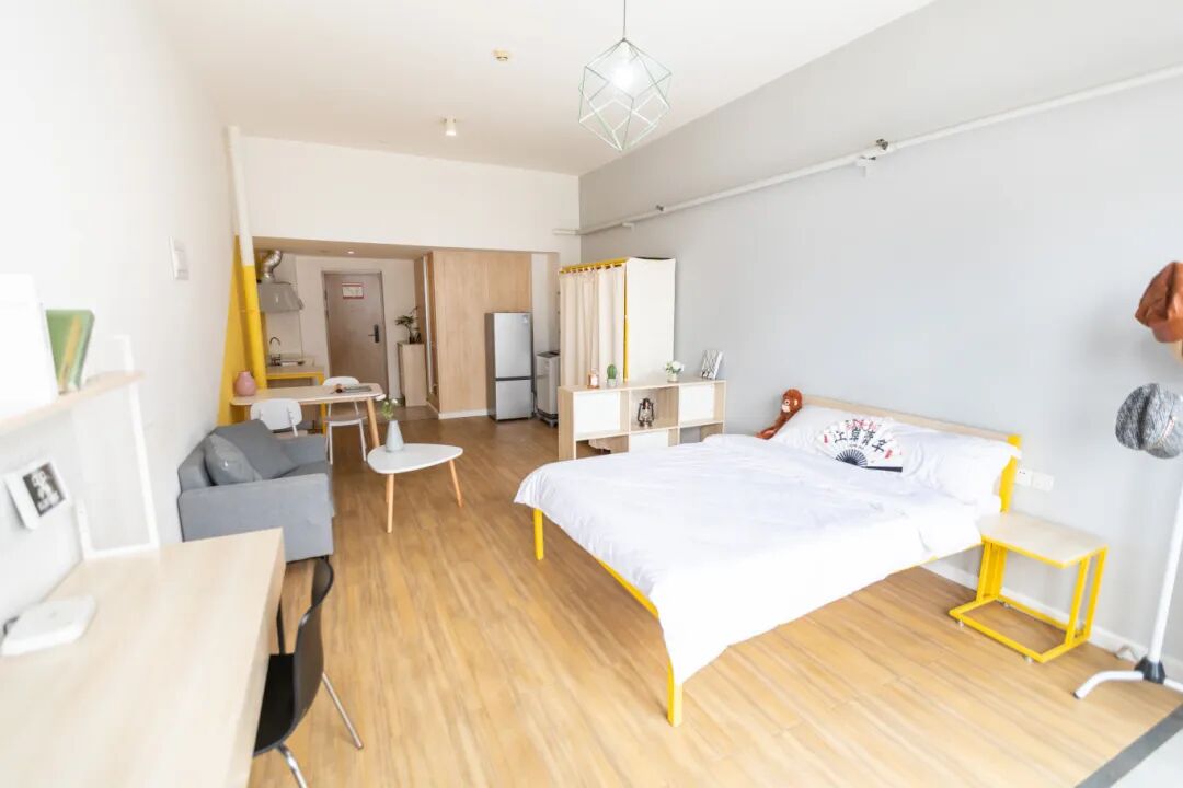 麻雀虽小,五脏俱全。公寓的单间内全都配有沙发、衣柜、书桌等实用家具,冰箱、空调、洗衣机等家电机器也一应俱全,为住户打造出拎包入住的温馨氛围。