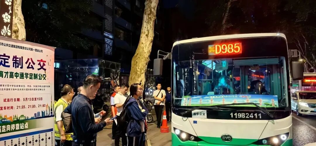 近日,武汉首辆“AI智能”通学定制公交D985准时出现在解放公园路解放大道口指定停车点,接送武汉市育才高中下晚自习的高三学生们。客满发车那一刻,武汉首趟“AI智能”定制公交通学专线开始试运营。