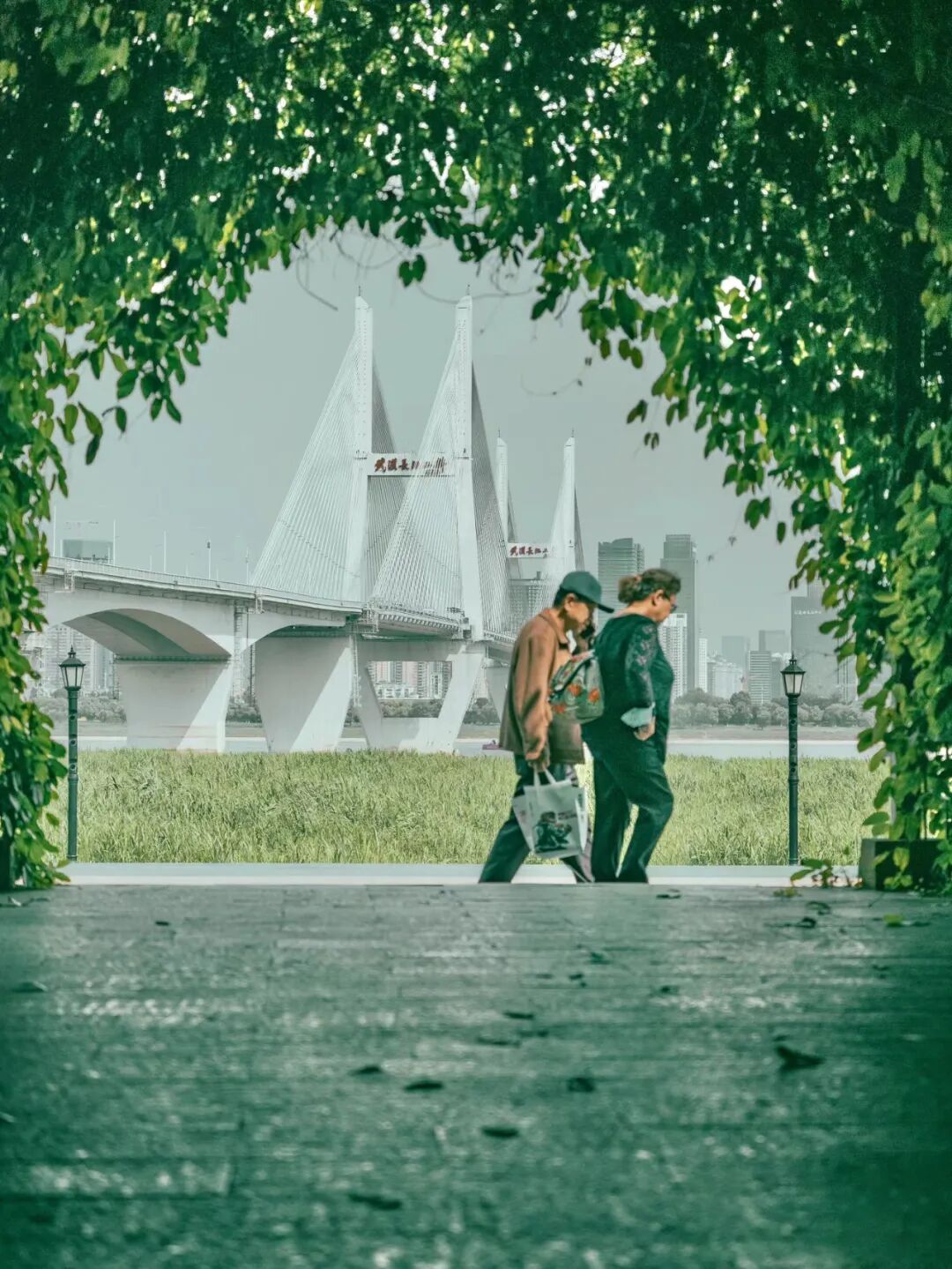 这里是一处由藤树形成的小绿道,以绿道的拱门为前景,以不远处的长江二桥为背景,犹如将拱门的另一端搭成一个小型T台,看过往的路人上演一幕幕生活的独播剧场。