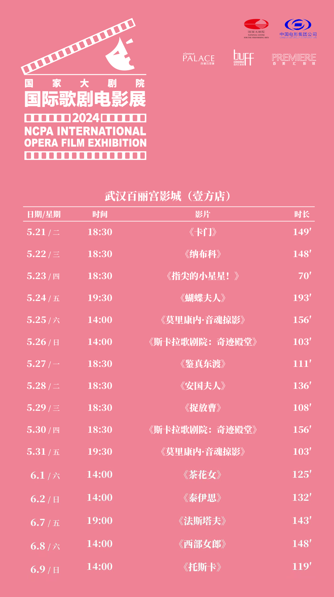 2024国家大剧院国际歌剧电影展定于5月20日至7月31日举行,武汉站将会在百美汇影城(激光IMAX恒隆广场店)、百丽宫影城(LUXE壹方店)、百方汇影城(武汉K11 Select店)同期展映,为观众献上家门口的歌剧艺术盛宴。