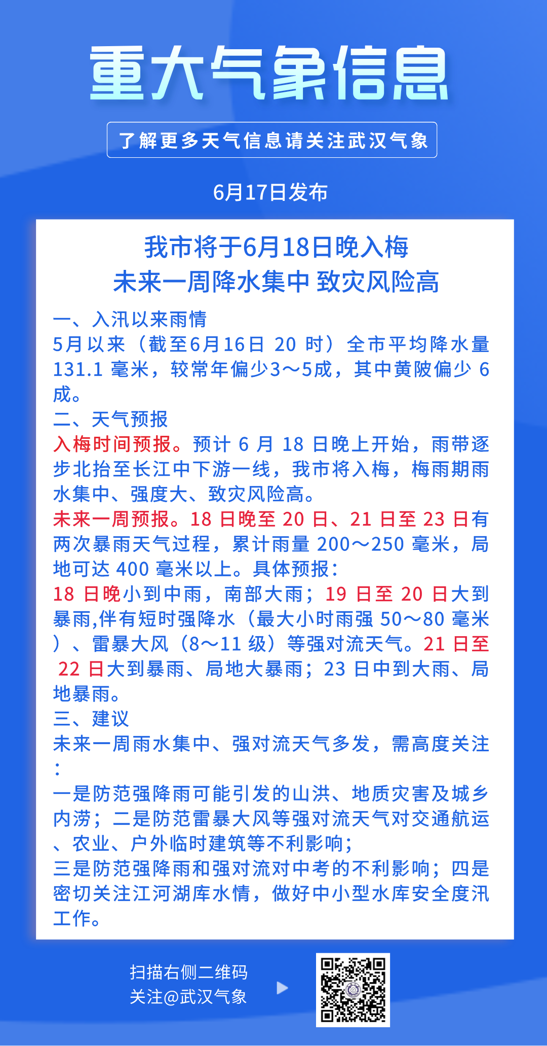 预计6月18日晚上开始,雨带逐步北抬至长江中下游一线,我市将入梅,18日晚至23日有一段降水集中期,降水强度大,致灾风险高。