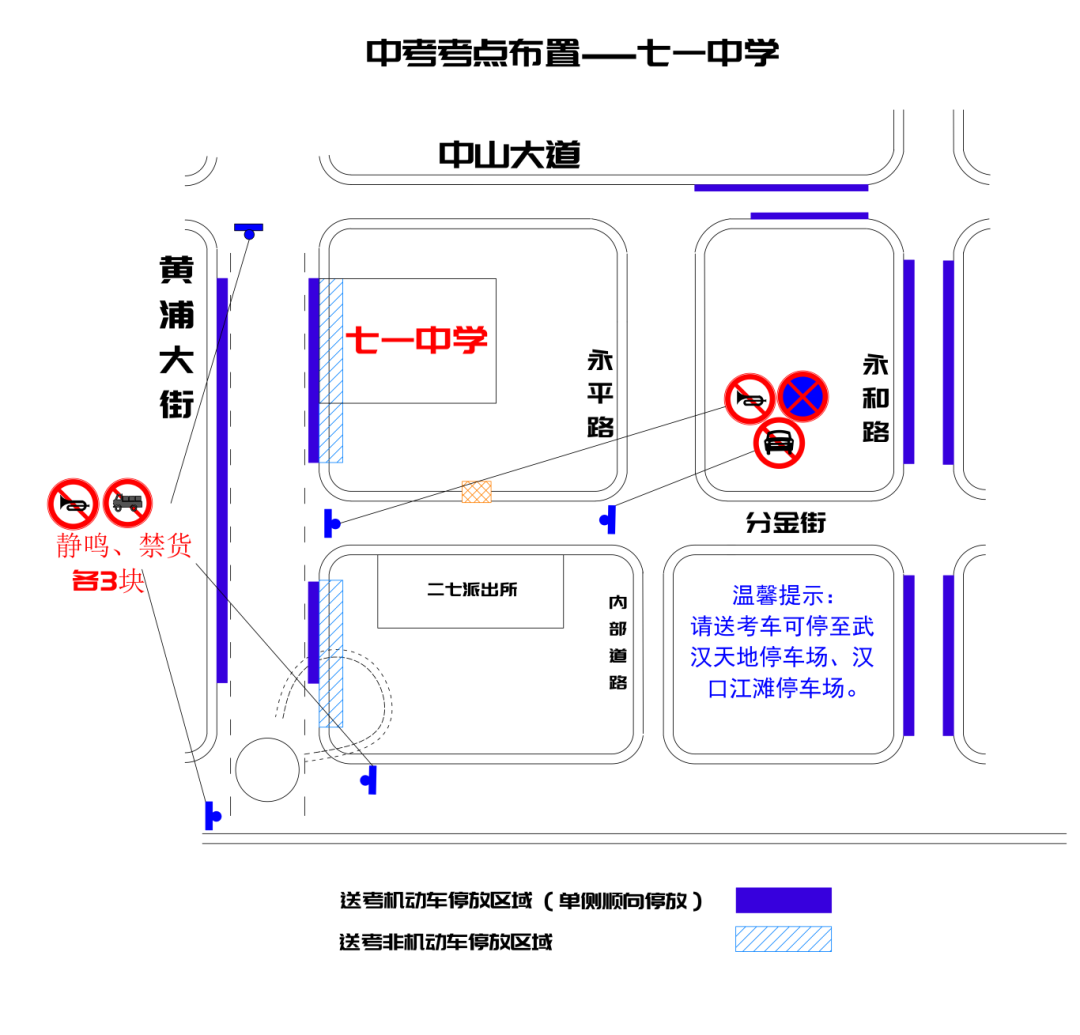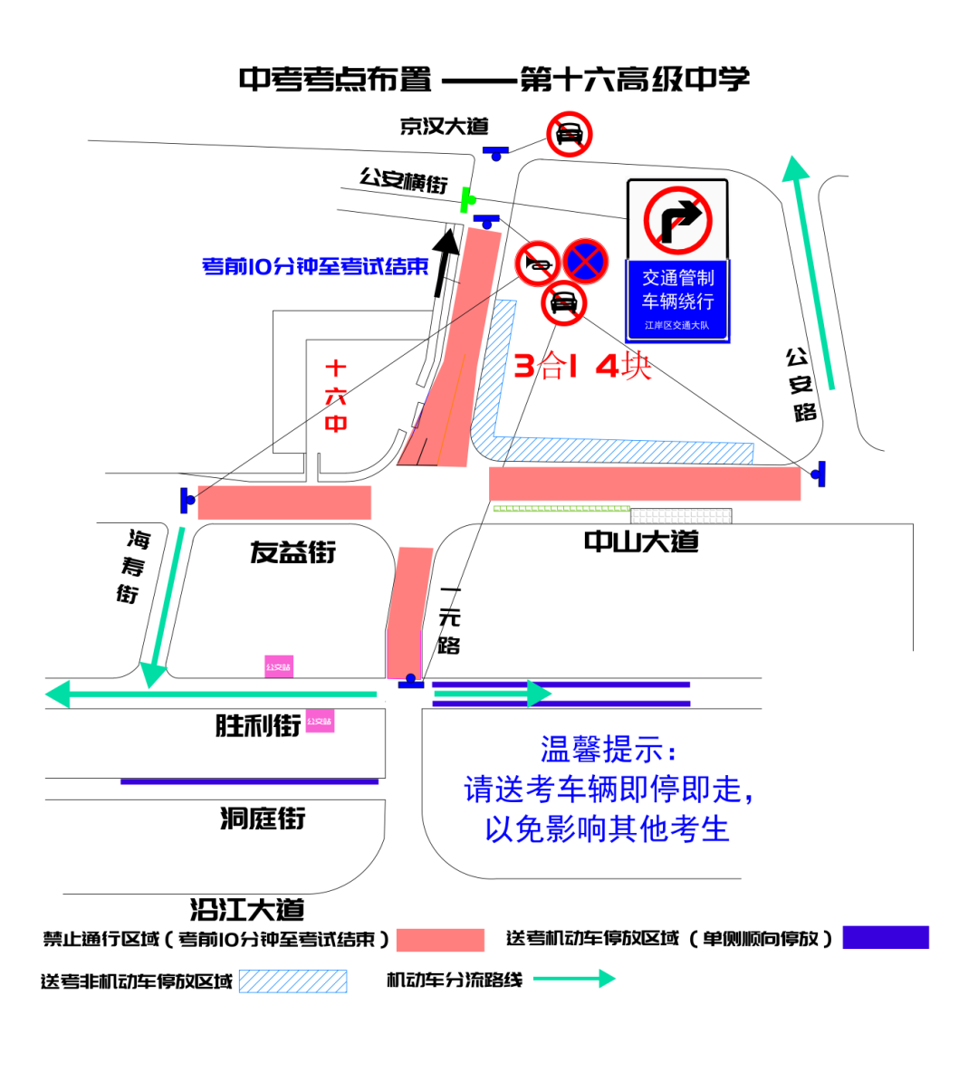 ???? 建议出行路线:一元路(公安横街至胜利街)、中山大道(海寿街至公安路)每日考前十分钟至考试结束禁止通行,建议绕行京汉大道、沿江大道、胜利街、公安路;注意此处路段禁停、禁鸣、禁行。