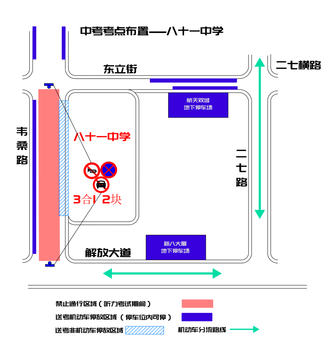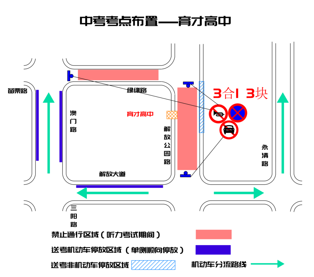 ???? 建议出行路线:解放公园路(绿缘路至解放大道)、绿缘路(澳门路至解放公园路)听力期间禁止通行,建议绕行永清路、澳门路、解放大道;考点周边道路禁停、禁鸣、禁行。
