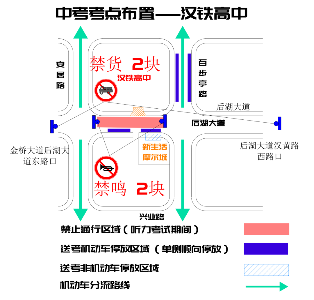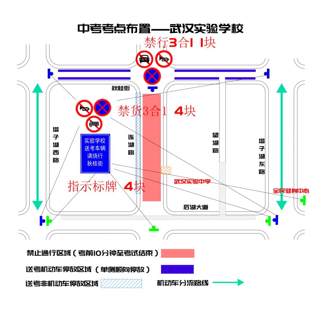 ???? 建议出行路线:连湖路(秋桂街至后湖大道)每日考前十分钟至考试结束禁止通行,建议绕行塔子湖东路、塔子湖西路;考点新增2块绕行指示标牌,可根据出行线路选择。