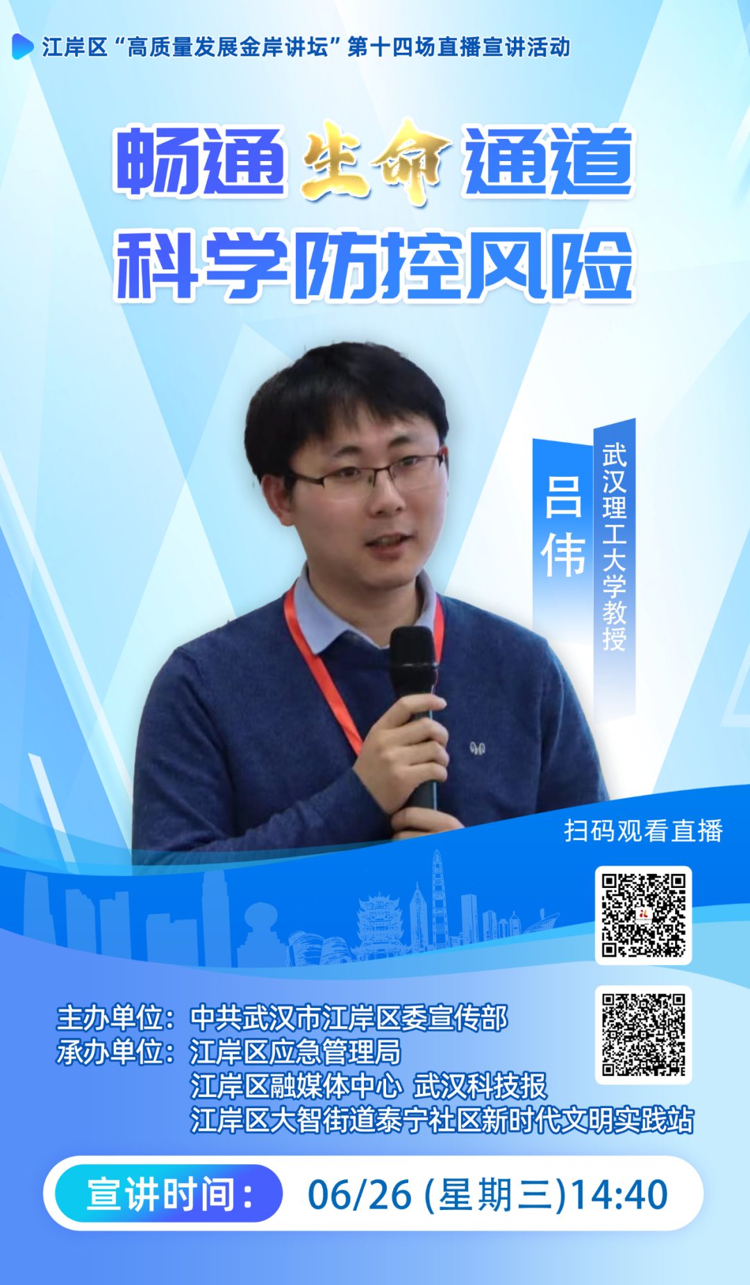 吕伟,武汉理工大学教授、博士生导师。现任武汉理工大学安全科学与应急管理学院副院长,湖北省危机与灾害应急管理研究中心、安全预警与应急联动技术湖北省协同创新中心副主任。兼任国际火灾安全科学协会、公共安全科学技术学会、中国职业安全健康协会、中国指挥与控制学会成员,武汉市应急管理专家、武汉市科技专家,武汉理工大学校党委宣讲团成员。兼任《Journal of Safety and Sustainability》、《中国安全科学学报》、《安全与环境学报》、《安全》青年编委。