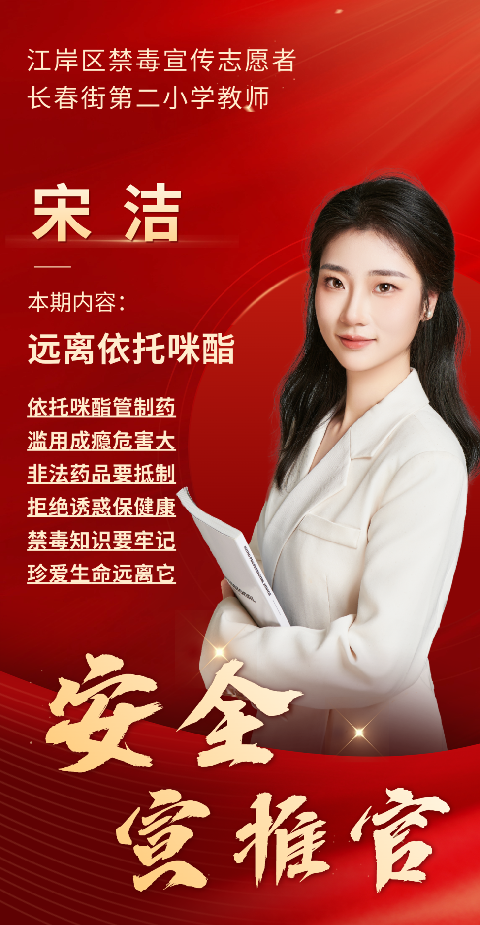 安全宣推官 宋洁:江岸区禁毒宣传志愿者、长春街第二小学教师。从教以来,一直担任班主任工作,在班级开展丰富多彩、行之有效的禁毒宣传活动,为学生的健康成长构建一道牢固的防线,用自己的行动诠释着禁毒工作的价值与意义。