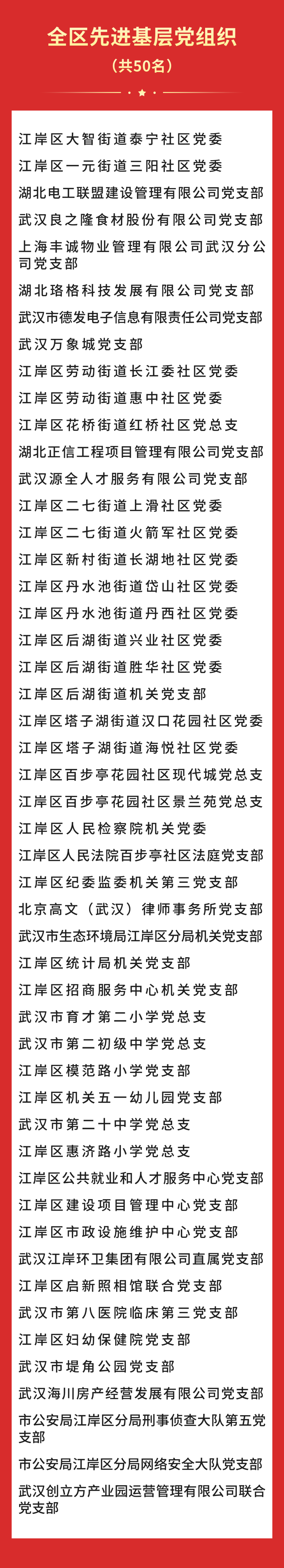今年是中国共产党成立103周年、中华人民共和国成立75周年,为表彰先进、树立典型、弘扬正气,激励全区各级党组织和广大党员奋勇争先、建功立业,6月28日,江岸区召开“两优一先”表彰大会,集中授予肖晶晶等100名共产党员“全区优秀共产党员”称号、授予罗婷等50名党务工作者“全区优秀党务工作者”称号,授予江岸区大智街道泰宁社区党委等50个基层党组织“全区先进基层党组织”称号。