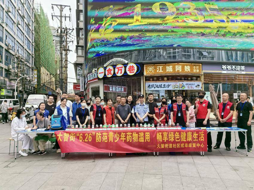 大智街道联合区科协、街道派出所、司法所、市场所、社区卫生院、戒毒康复中心,在江汉路步行街商业广场举办“6.26防范青少年药物滥用 畅享绿色健康生活”禁毒宣传活动。通过现场展示毒品模型、发放宣传资料,使来往居民更加了解日常生活中毒品的危害,让拒毒、防毒意识深入人心。