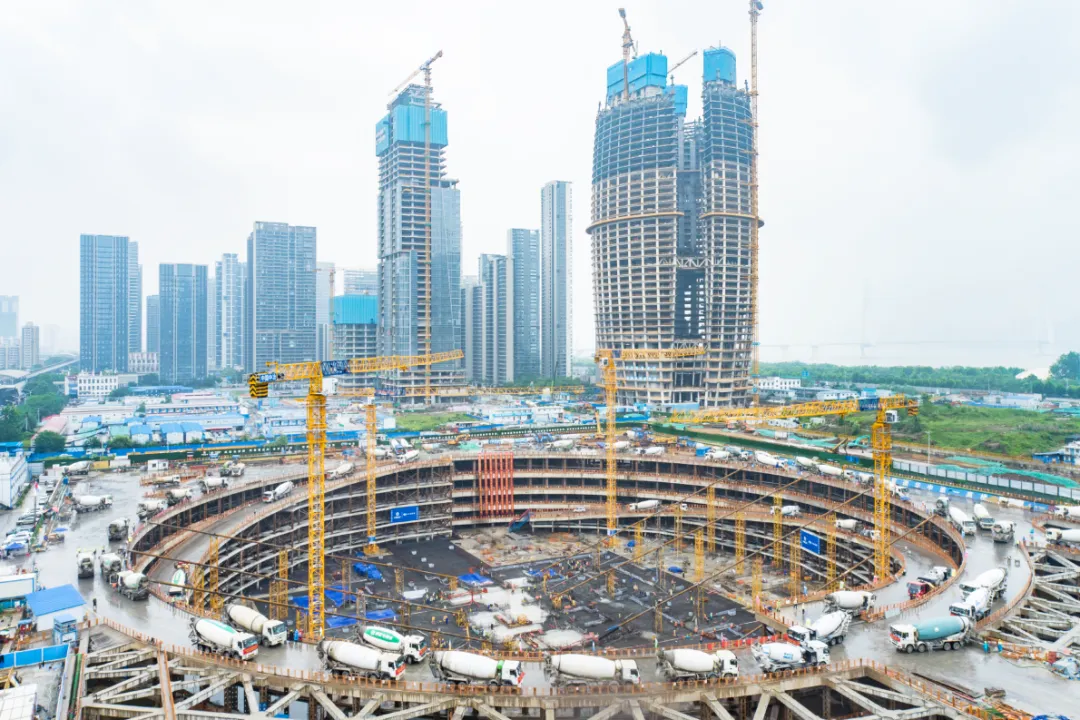 项目一旁,武汉周大福金融中心的施工同样开足马力,直径达188米“超级基坑”宛若一个巨大的圆盘。5月底,项目主塔楼筏板浇筑一次性完成4.3万立方米,正式“扎稳马步”,开始向上“拔节”。这里将建成国内最大体量的周大福金融中心,集企业总部、商务办公、高端商业服务、文化旅游及创意产业于一体,以475米的建设高度成为武汉城市新地标。