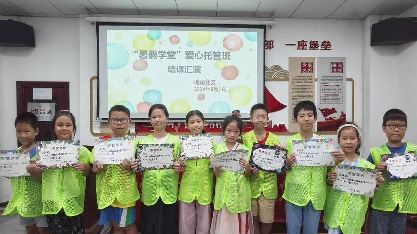 丹水池街道堤角社区青少年空间暑假学堂“爱心托管班”迎来结业汇演。孩子们逐一展示诗词朗诵、歌曲演唱、乐器演奏、魔术、贯口等表演,老师们为大家颁发多个奖项,祝愿孩子们在新学期茁壮成长。
