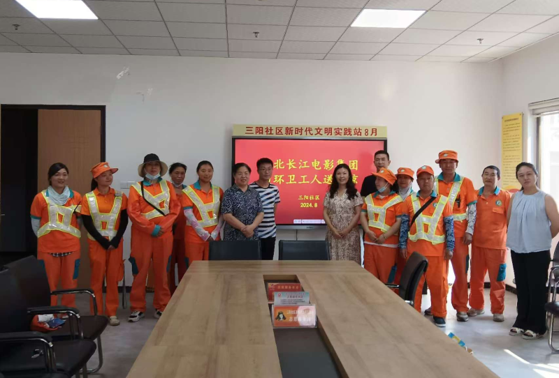 一元街道三阳社区联合辖区共建单位湖北长江电影集团有限责任公司,开展送清凉慰问活动。向辖区户外工作者送去绿豆、酸梅汤等防暑物资,为他们对城市美好环境付出的辛勤劳动表示感谢。