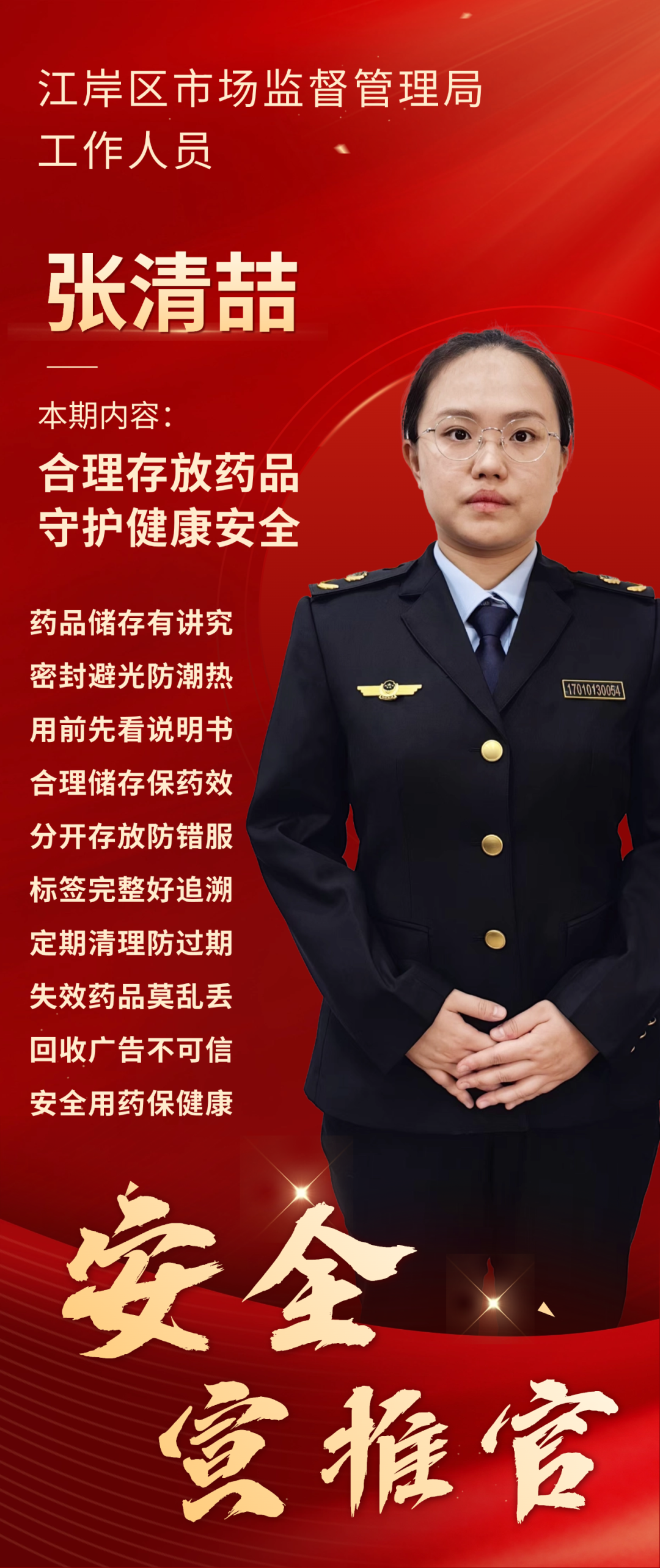 “安全宣推官”张清喆:江岸区市场监督管理局药品安全宣讲员,从事药品、化妆品和医疗器械监管和不良反应监测工作,致力于保障药品、化妆品和医疗器械产品质量安全。