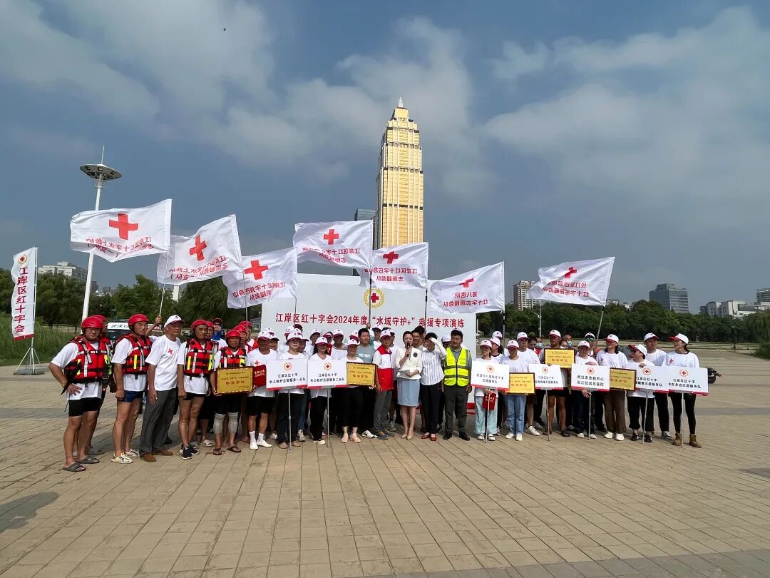 区红十字会在汉口江滩三阳广场主办“水域守护+”救援专项演练活动。通过现场模拟群众落水场景,演练快速救援、橡皮艇救援、翻舟自救和昏迷群众紧急救治共4项水上应急救援科目,共70余人参加演练。