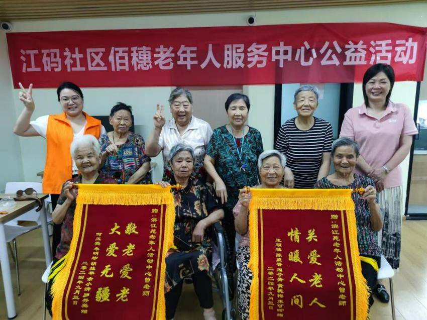 二七街道江码社区佰穗老年人服务中心收到两面锦旗。锦旗分别书写“敬老爱老 大爱无疆”“关爱老人 情暖人间”,来自于10名平均年龄80岁的老人赠送,感谢中心工作人员的关心和照护。