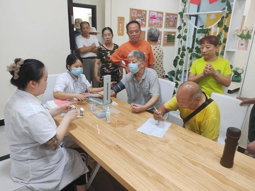 丹水池街道汉黄社区联合岱山医院举办健康义诊活动。医护人员对居民进行身体检查,为其讲解日常护理注意事项,增强居民对疾病的预防意识。