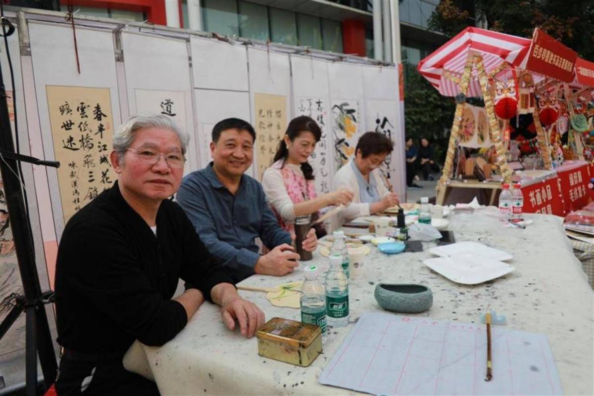 公益集市现场,社区书画协会铺上毡垫,摆上笔、墨、纸、砚,书写“文化社区”的“幸福生活”,巧手工艺志愿服务队悬挂“十二生肖”的雕刻剪纸,温馨巧手志愿服务队的针织扇和墨池书友志愿服务队的梅、兰、竹、菊等书画扇面相得益彰……辖区9个居委会的特色志愿服务队依次摆开有文化、有韵味、有创意的文创作品,彰显百步亭社区的“亭文化”。