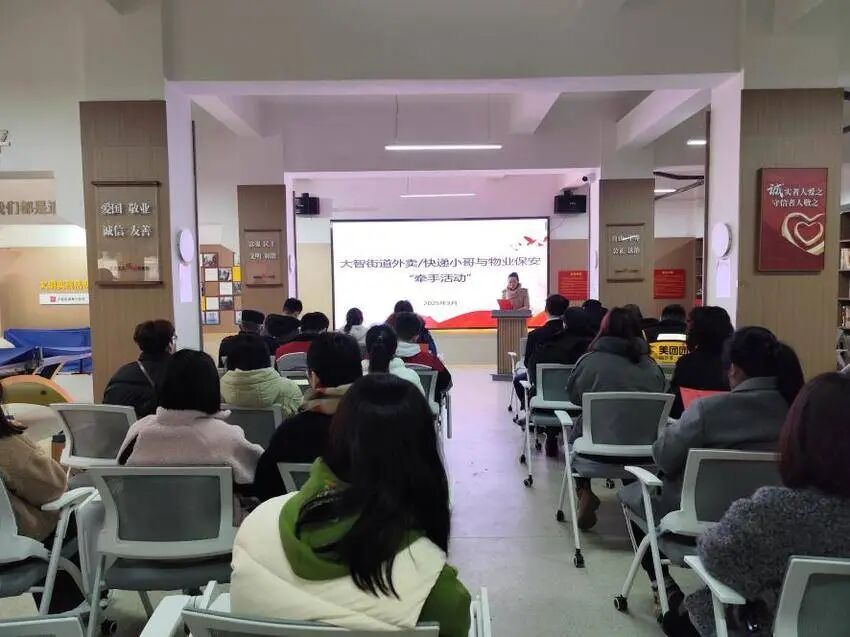 大智街道在泰宁社区开展“牵手活动”,外卖小哥、快递小哥与物业保安参与,通过宣读倡议书、承诺行为公约等形式增进理解信任,制定进出小区规范,提供多项服务及志愿服务站点,推动新就业群体融入基层治理。
