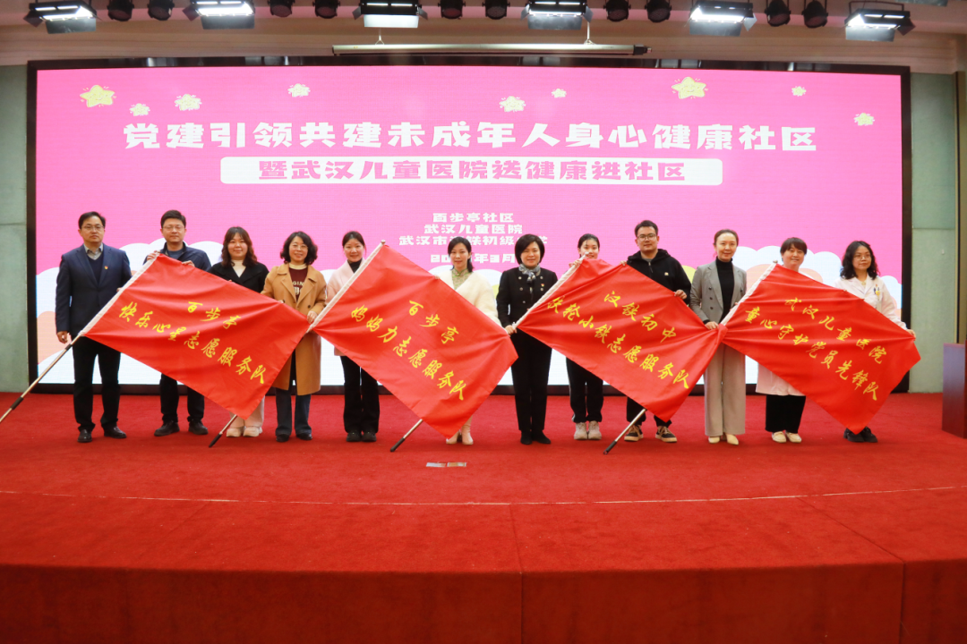 现场还为汉铁初中扶轮小铁志愿服务队、百步亭社区妈妈力志愿服务队、武汉儿童医院童心守护党员先锋队、百步亭快乐心星志愿服务队4支志愿服务队授旗。