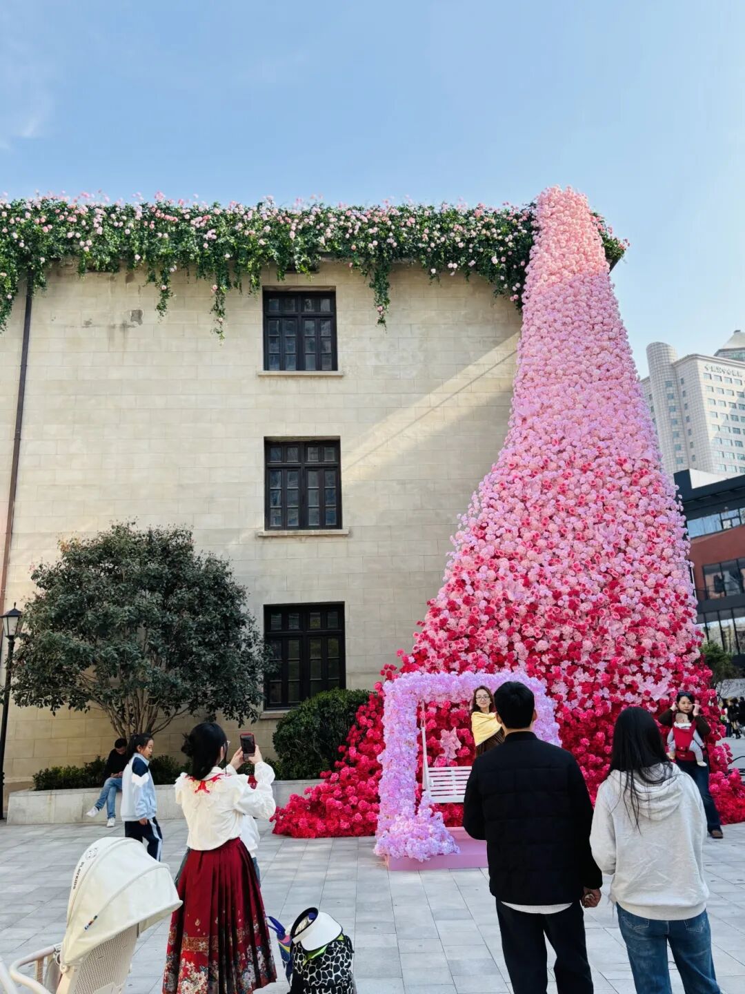 当看到超大的粉色瀑布花墙时