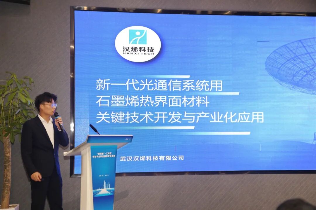 在项目路演环节,武汉汉烯科技有限公司总经理助理唐佳杰介绍了在新一代光通信系统应用场景下,石墨烯热界面材料关键技术开发与产业化应用。热界面材料是发展光通信系统的关键环节,是热量散出的必经之路,但高端热界面材料多依赖国外进口。“我们将氧化石墨烯粉末制备成浆料,再通过高温碳修复技术将其制备成石墨烯泡棉,这有点像将面粉和成面浆,然后再制作成切片吐司。”唐佳杰说,公司能开发具有高稳定性、高使用寿命的碳基热界面材料即石墨烯泡棉,能颠覆传统热界面材料市场的竞争格局。