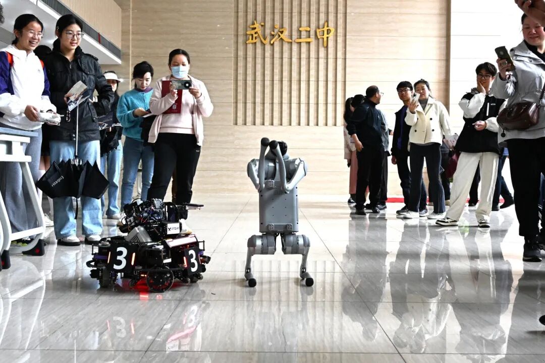 与此同时,校园一角,学生自主编程的机器狗随着音乐灵活转圈、跳跃,“圈粉”了一波学生和家长。物理社成员指导参观学生体验“龙洗盆”实验:只要用手摩擦两端,它就会发出嗡嗡的声音,里面的水还会开始跳舞。化学实验室里,高二学生现场演示容器内溶液不停变色的趣味实验,教学生怎么玩,让大家直呼“科学太酷了!”