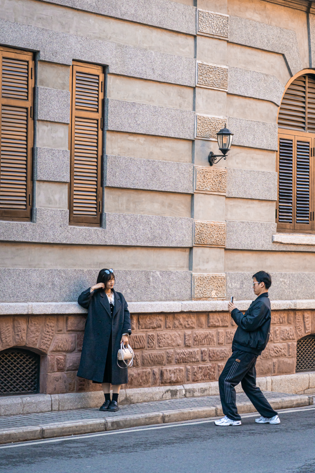 Charlotte举着相机,在黎黄陂路的红砖房前定格春日光影。