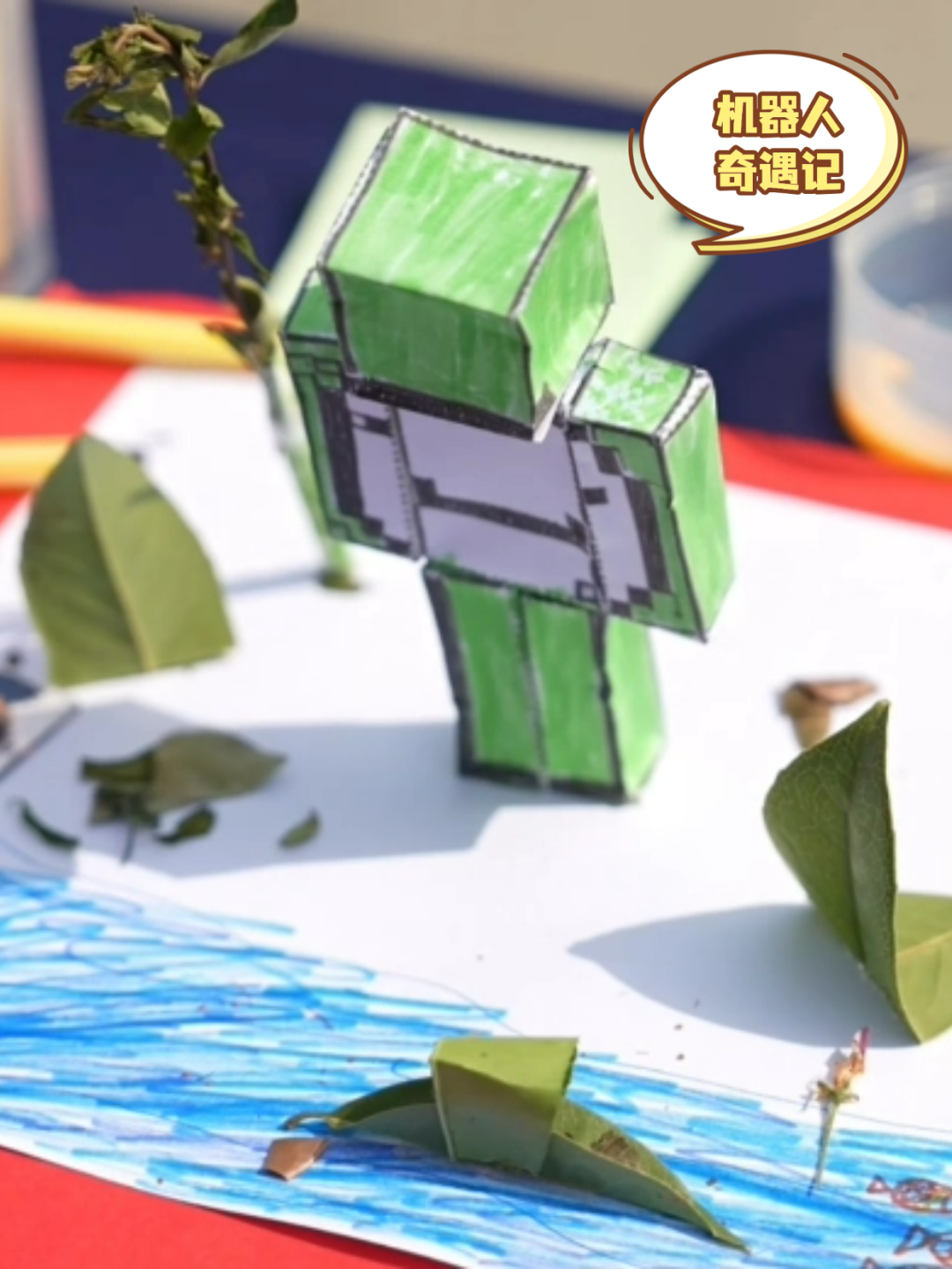 五年级五班学生马心楚别出心裁地用树叶和卡纸制作了一个立体机器人:“我想要让它像一棵树一样坚挺,不要为其他的事情而烦恼。希望我们都不要被其他人的看法所影响,坚持做自己才是最重要的。”