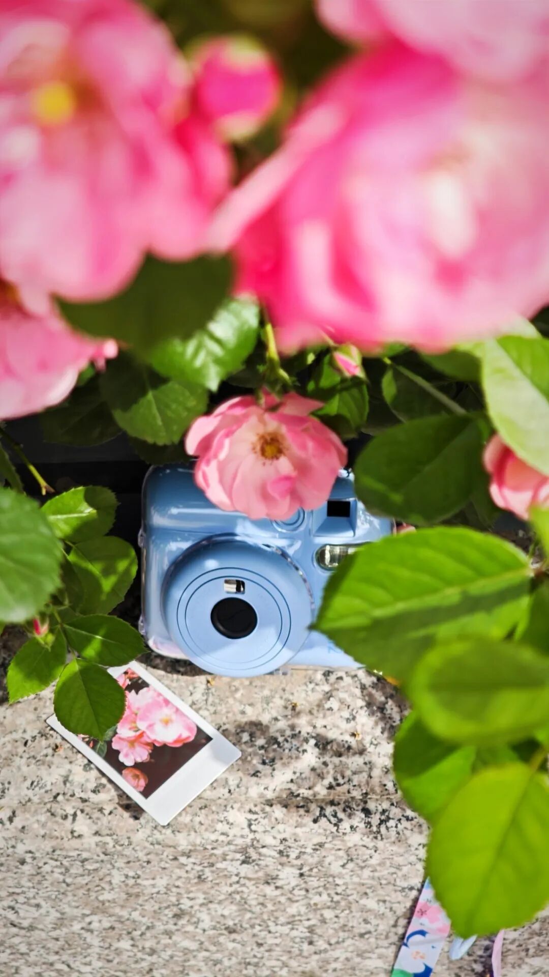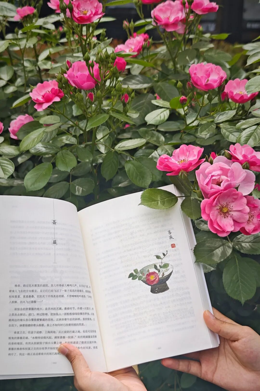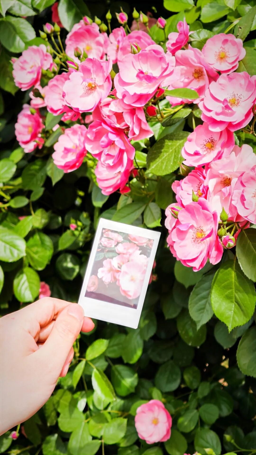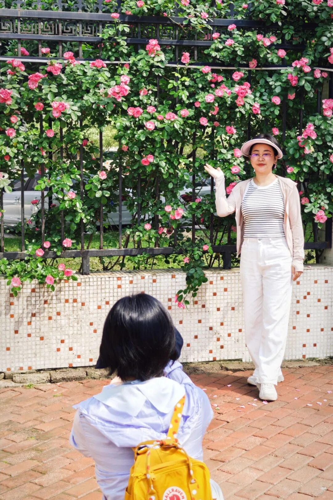 “往这边站站,对,和花再靠近一点……”把自己和开得最盛的那几丛蔷薇一起框进镜头里。