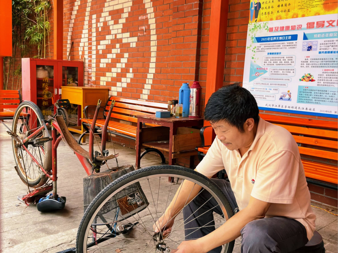 小区进口,墙上有一个大大的“修”字。这是一个修车铺,修车师傅苏成财干了30多年。这次改造,也保留了下来。“这个铺子给我们留下了独有的记忆。”居民余奶奶说。