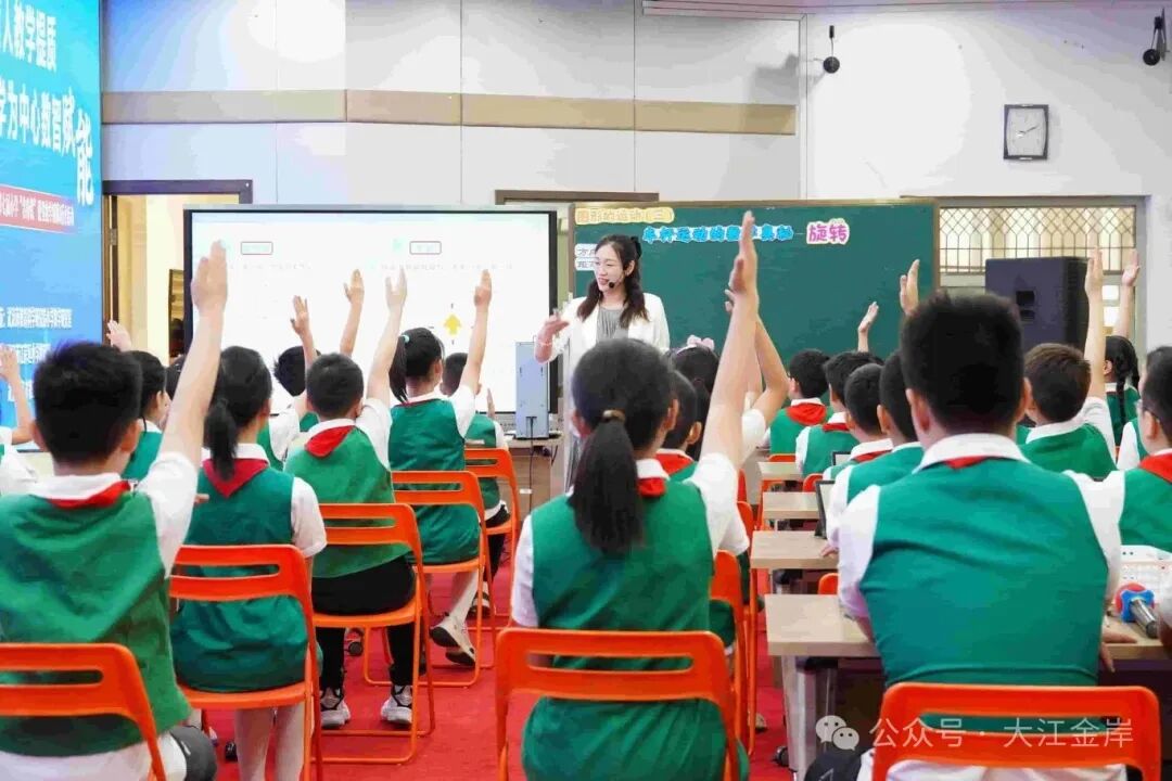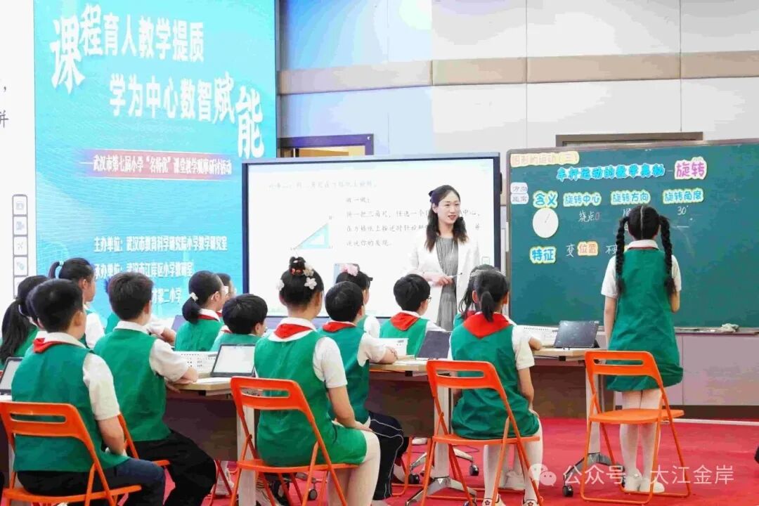 当天,数学分会场的展示课环节备受瞩目。江岸区学科带头人、武汉市育才第二小学董敏老师执教的《车杆运动的数学奥秘——旋转》精彩纷呈。课堂上,董老师引入AI智能学伴“同成”,以生活中的情境导入,引导学生类比探究旋转核心要素。