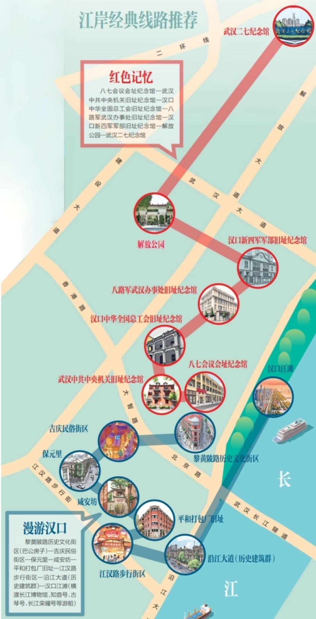 中山大道两侧,8处革命文物建筑被修缮和维护,八七会议会址、中共中央机关旧址等29处场馆,纳入5条“红色旅游精品线路”,串珠成链。