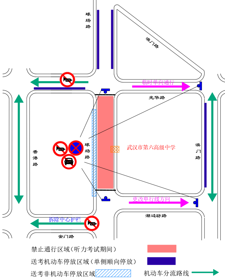 一元路(公安横街至胜利街)、中山大道(海寿街至公安路)每日考前十分钟至考试结束禁止通行,建议绕行京汉大道、沿江大道、胜利街、公安路。一元路胜利街路口、中山大道海寿街口禁停、禁鸣、禁行。