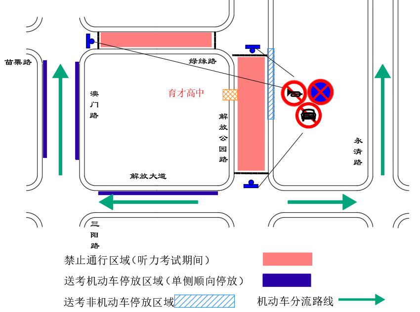解放公园路(绿缘路至解放大道)、绿缘路(澳门路至解放公园路)听力期间禁止通行,建议绕行永清路、澳门路、解放大道。绿缘路澳门路口禁停、禁鸣、禁行。