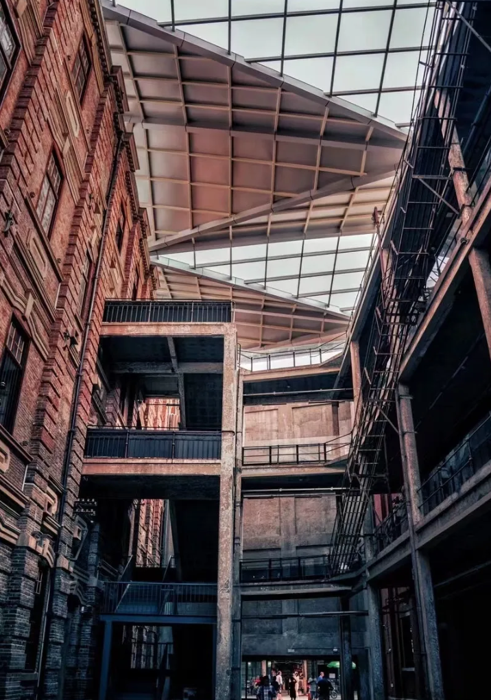 新铺的钢结构透明穹顶,与文艺书店、咖啡店、脱口秀剧场等现代元素相映。红砖墙面、铁质楼梯散发的近代工业风,与各类业态、展览相得益彰,尽显古今碰撞交融之妙。
