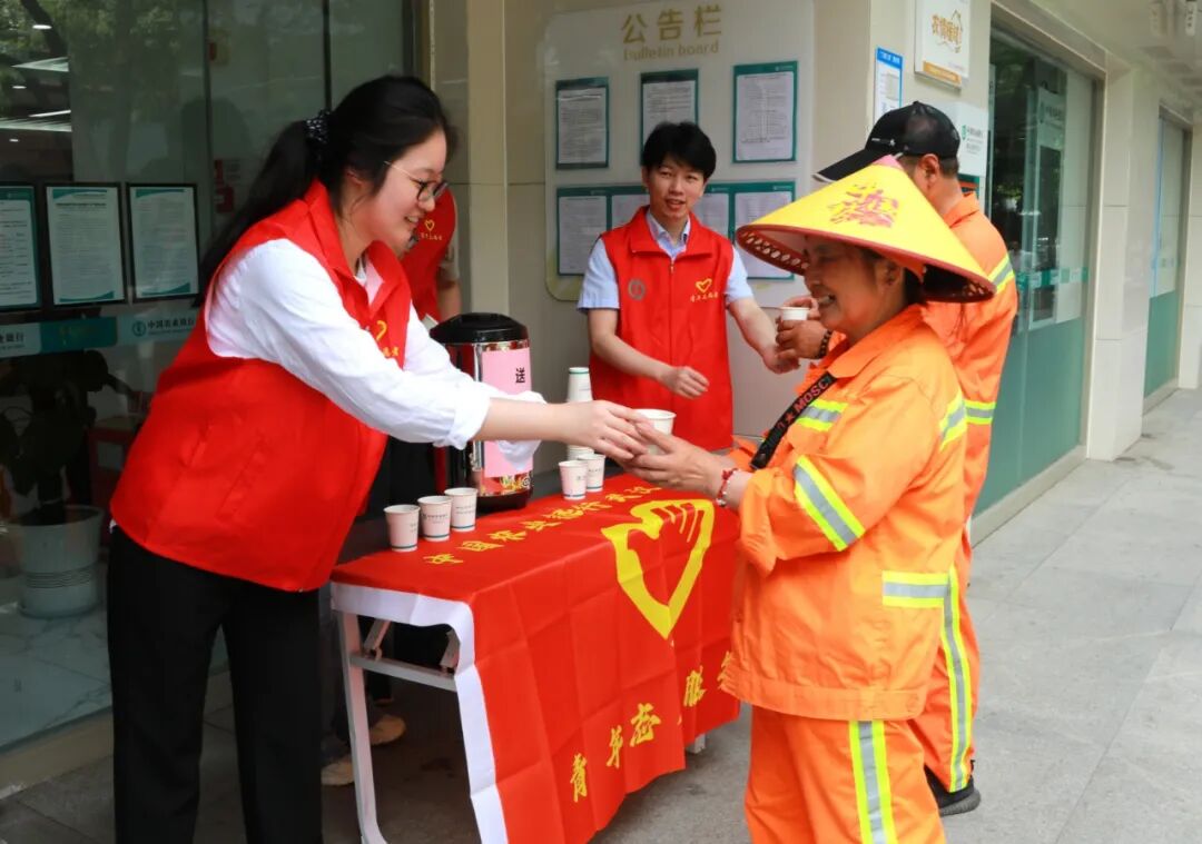百步亭社区工会携手共建单位中国农业银行开展“致敬城市美容师”送清凉活动,为辖区环卫工人送上矿泉水、凉茶等消暑饮品,以及装有冰袖、清凉油、冰凉贴的“清凉怡夏包”。