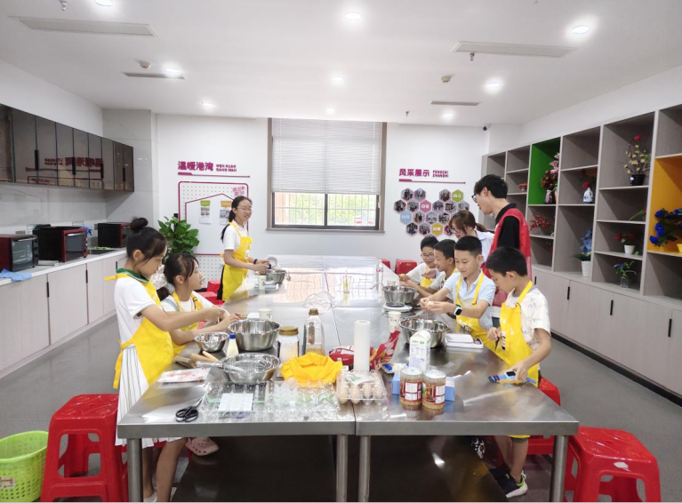 塔子湖街道跃进社区开展跃进“焙”星人成长小组活动。社工详细讲解戚风蛋糕坯搅拌技巧、烘烤温度控制、沙拉酱与肉松配比,提升青少年动手、创造和社交能力。