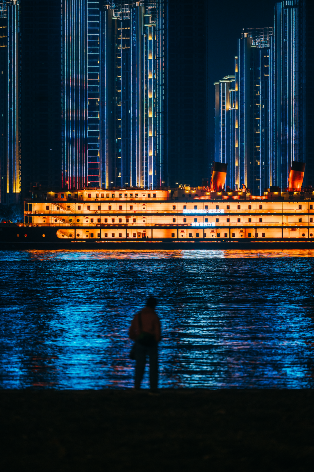 渡轮拖着长长的灯影