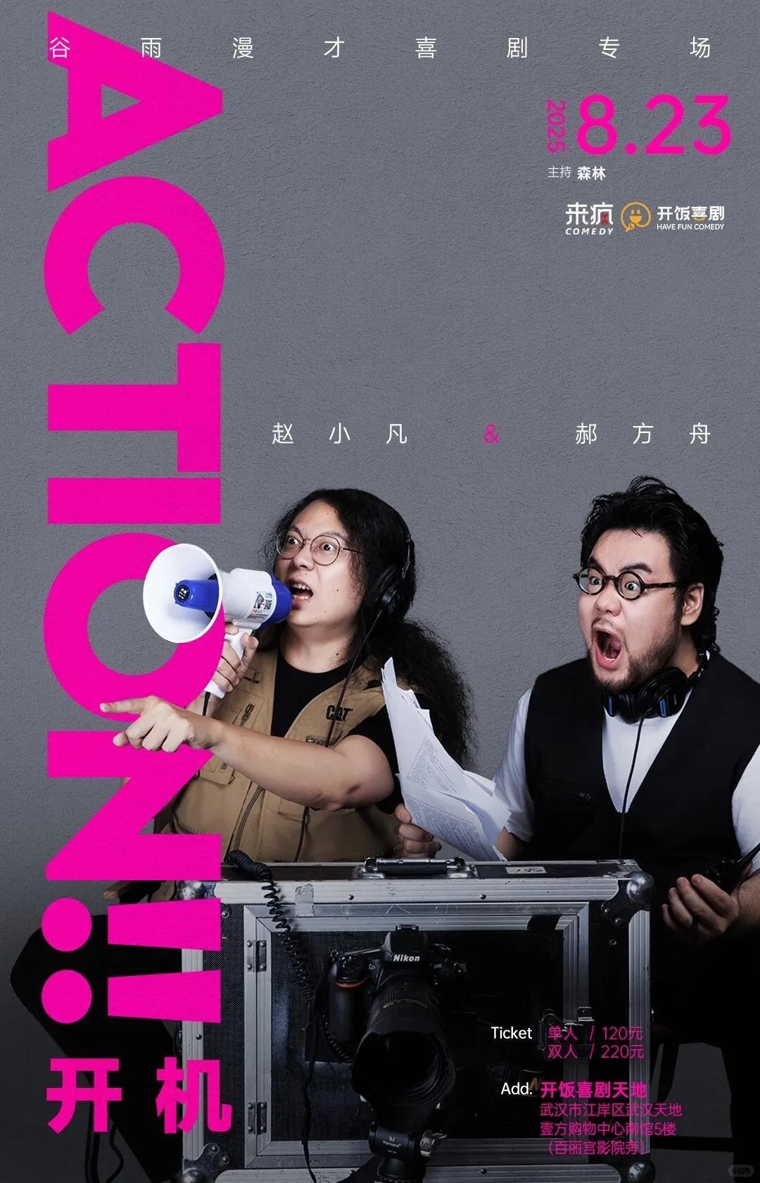 除了单人脱口秀,谷雨漫才喜剧专场《ACTION!开机》也同样值得期待!这次专场由赵小凡、郝方舟主演,森林担任主持。他们将用独特的表演风格,幽默诙谐的对白,给观众带来妙趣横生的喜剧体验。不同的风格,同样的爆笑体验!谷雨漫才喜剧专场《ACTION!开机》