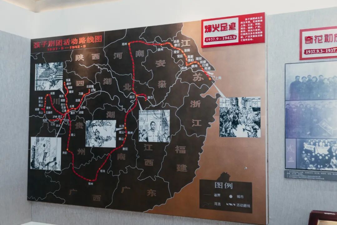 上海沦陷后,孩子剧团撤离上海,途经南通、徐州、郑州、武汉、长沙等地,行程2万余公里,每到一地,孩子们就用歌声、戏剧、舞蹈等宣传抗日,鼓舞同胞踊跃参加抗日救亡活动。多数孩子,因为父母在抗日战争中牺牲,或被日寇杀害而成了孤儿,也有孩子为了宣传抗日主动离开家庭,加入剧团,他们小小的心中,燃烧着熊熊的火焰,不惧危险,勇往直前。正如孩子剧团宣言中所写:“我们知道我们不能上前线去同鬼子拼……我们愿意永远演戏,愿意上前线去演,愿意到内地去演,也愿意到受难的同胞里面去演。”朴素的语言,道出孩子们的赤子之心。