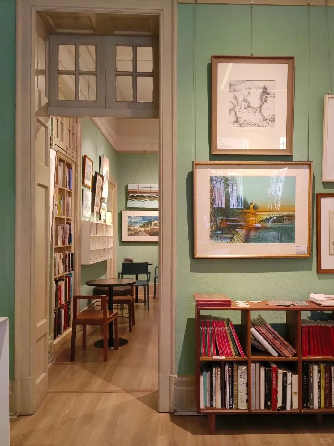 黎黄陂路的美莲社艺术空间,薄荷绿的装修风格清新又浪漫,墙上挂着的版画作品与弥漫的咖啡香气、精致的文创产品一起,以更日常的姿态呈现在观众面前。