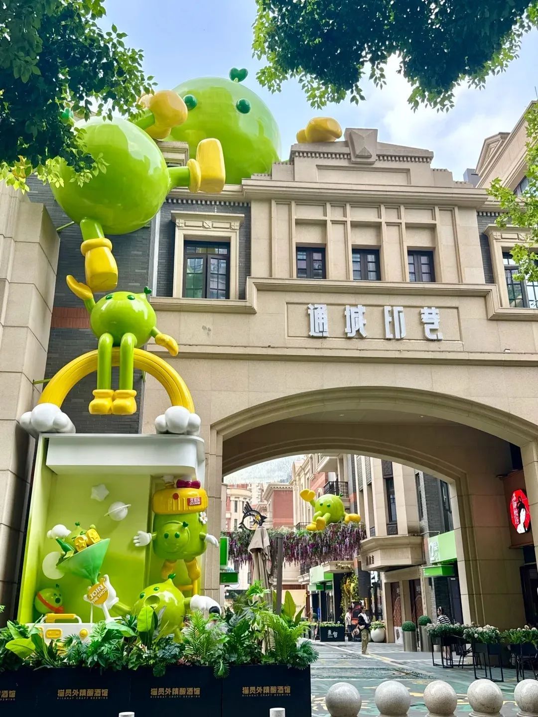 粉白色玫瑰瀑布花墙、绿色IP“豆皮皮”、 “武汉”云境天幕……吉庆街三期•通城印巷随处可见的彩色打卡装置,给市民带来一场视觉多巴胺之旅。