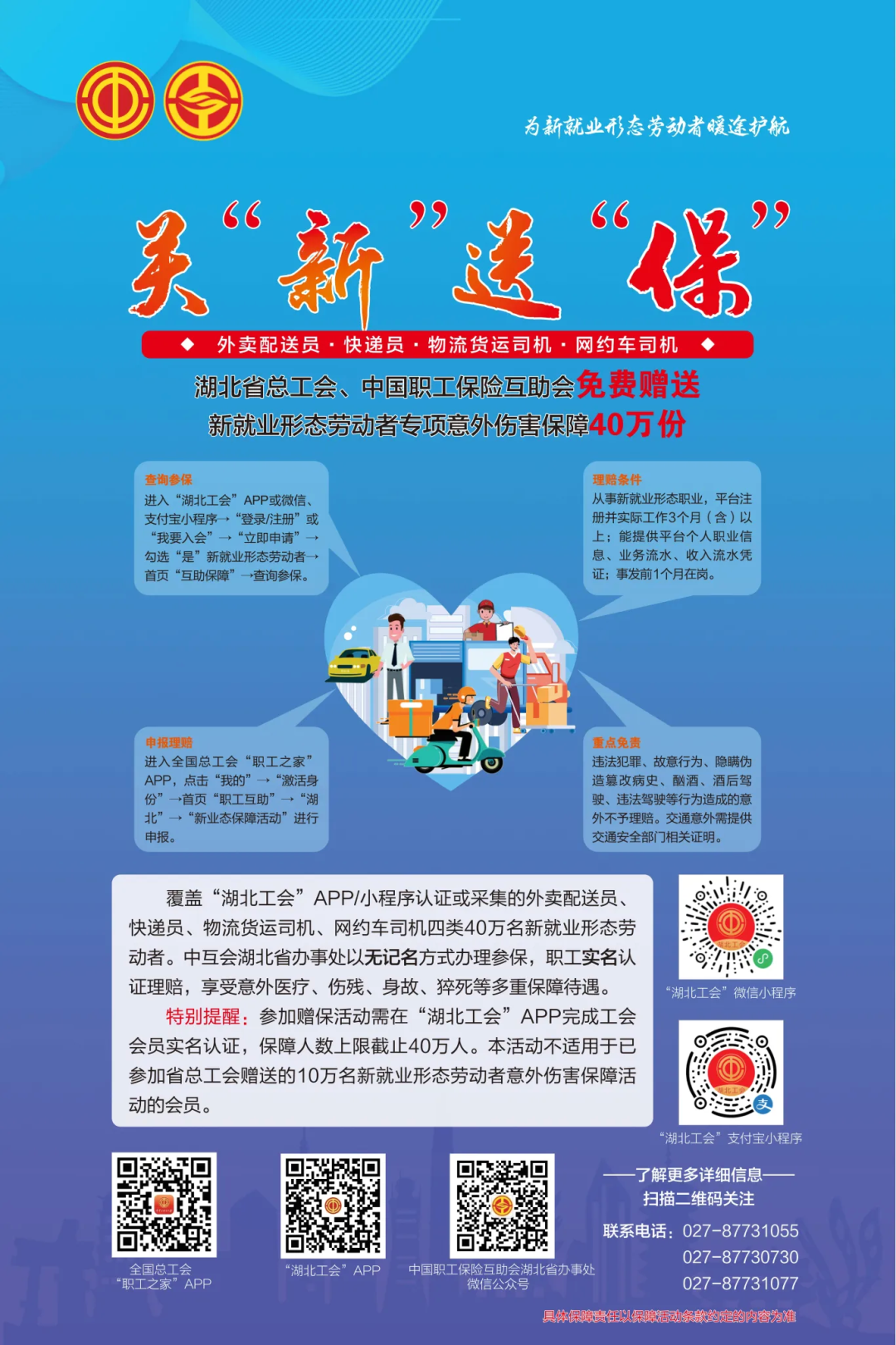 覆盖“湖北工会”APP或微信、支付宝小程序认证或采集的外卖配送员、快递员、物流货运司机、网约车司机四类新就业形态劳动者。中互会湖北省办事处以无记名方式办理参保,职工实名认证理赔,保障人数上限截止40万人。