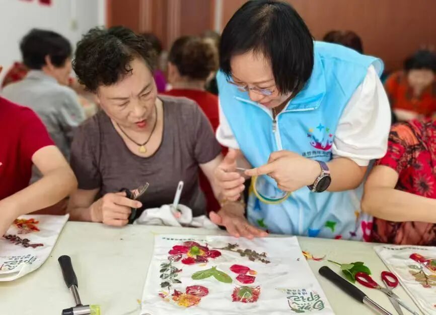 百步亭社区悦秀苑开展“科技改变生活,创新赢得未来”解忧沙龙活动,通过“非遗技艺体验+自然科学普及”的方式,组织居民参加植物拓染特色体验活动,在一锤一染间把自然“袋”回家。