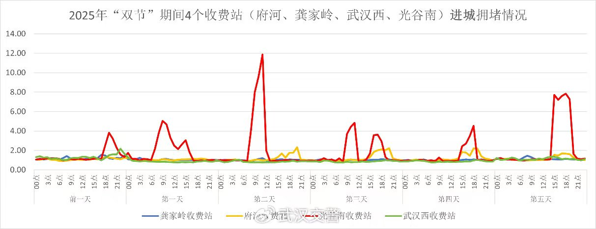出城方向拥堵较为突出的为龚家岭、府河收费站,其中龚家岭收费站预计在放假前一天16时至19时车流量集中;府河收费站在假期首日8时至11时交通压力明显增大。