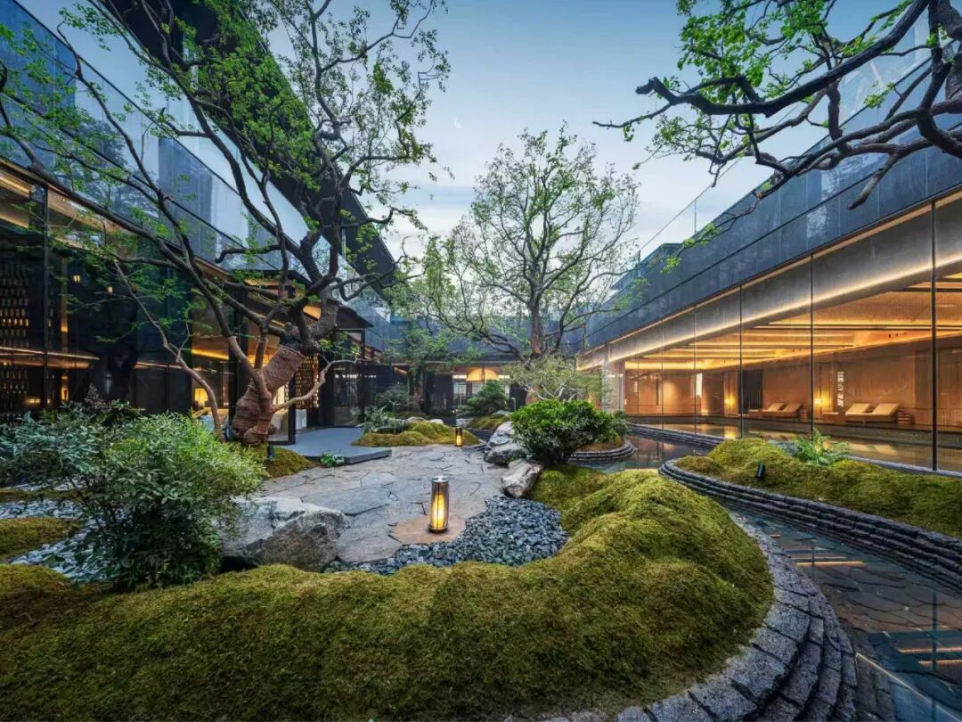 第一个“岛”就在小区大门处。高7米、长77米左右的大门,用墨绿色碧潭金沙石材做墙面,看着古朴又雅致。四周绕着缓缓流淌的活水,天井中央立着一棵90多岁的老朴树。“这里借鉴了徽州古建筑‘四水归明堂’的理念。”